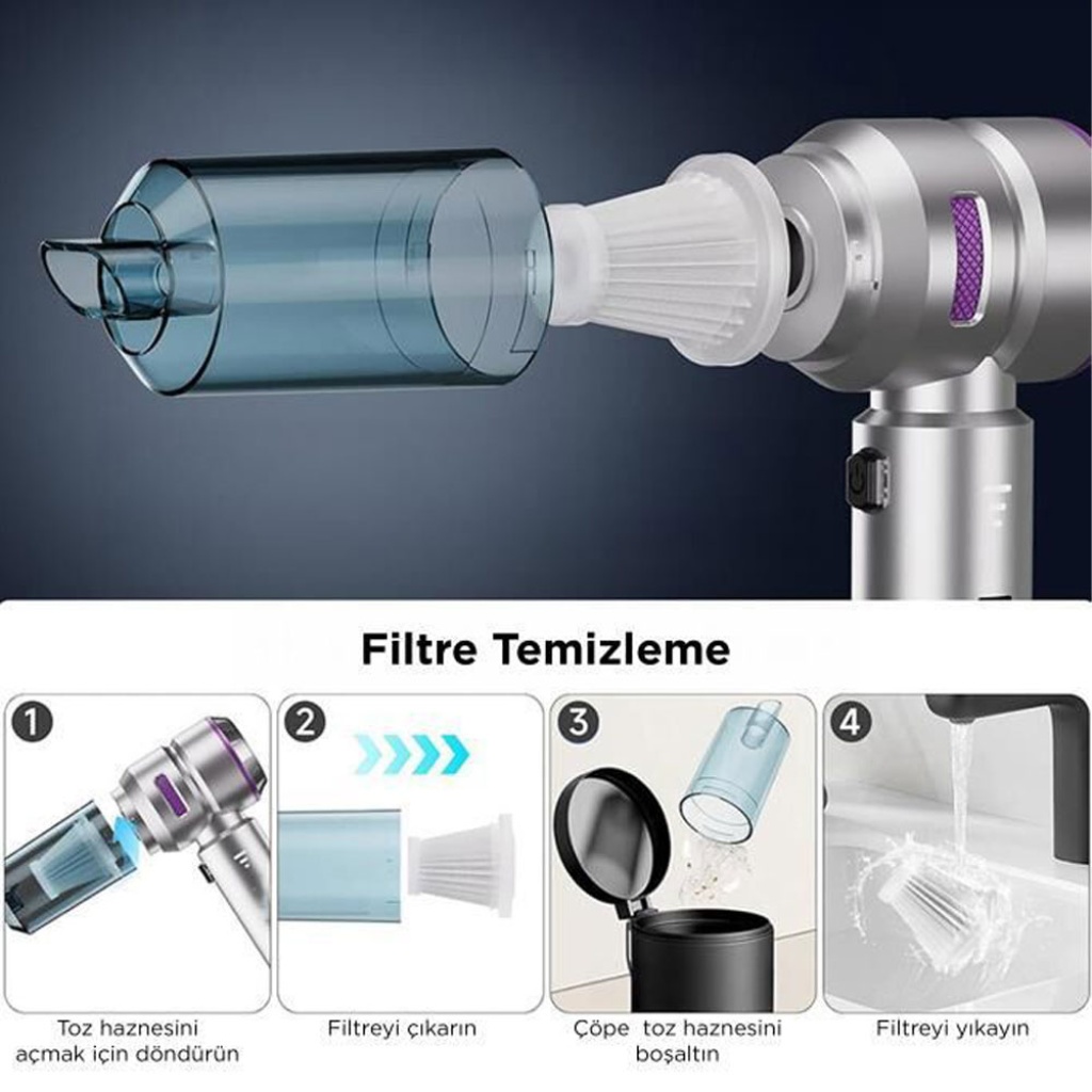 Üflemeli Şarjlı Araç Mini EL Süpürgesi 16.000PA Emiş Güçlü 4İN1 Araba Süpürgesi Mavi HL121